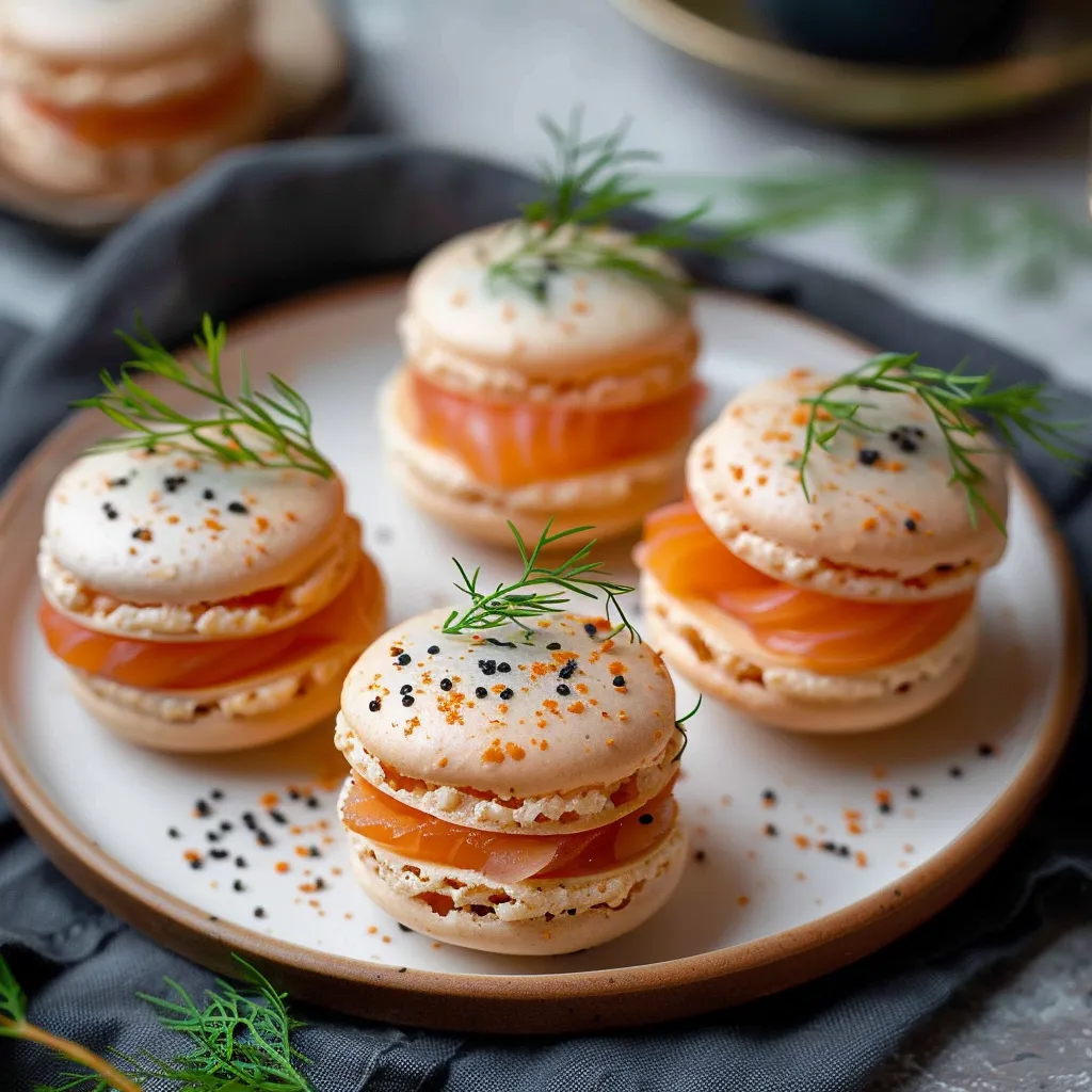 La magie de ces macarons réside dans le contraste entre la coque délicatement sucrée et la garniture subtilement salée. Le fromage frais apporte sa texture soyeuse pendant que le saumon fumé dévoile ses notes iodées.